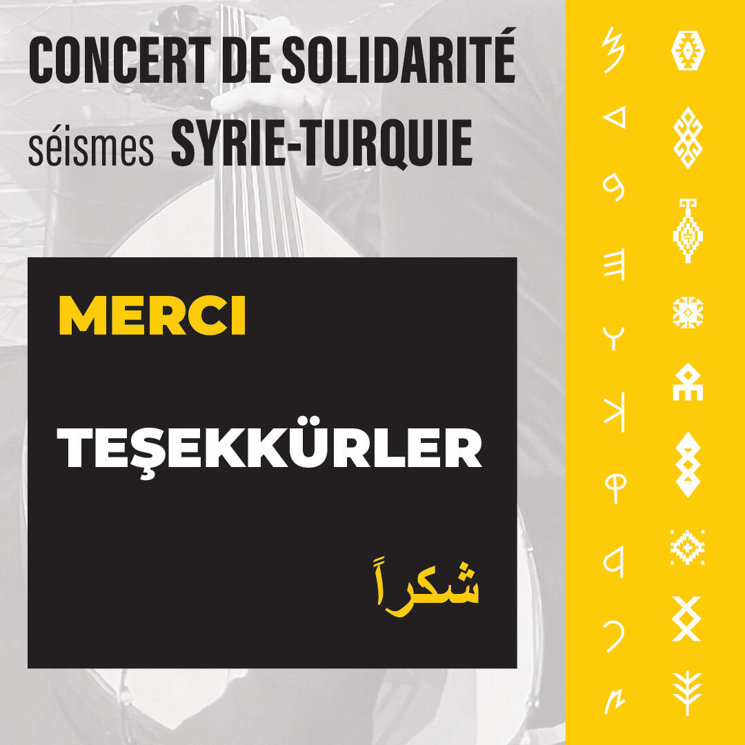 L'intégralité des recettes de la billetterie et du petit moment de convivialité prévu après le concert sera reversée à parts égales à deux ONG locales : Ahbap (Turquie) & Molham Team (Syrie).Cet évènement est rendu possible grâce à l'accueil bienveillant et l'aide du Centre International des Musiques Nomades, ainsi qu'à diverses contributions de soutien.Pour tout renseignement :